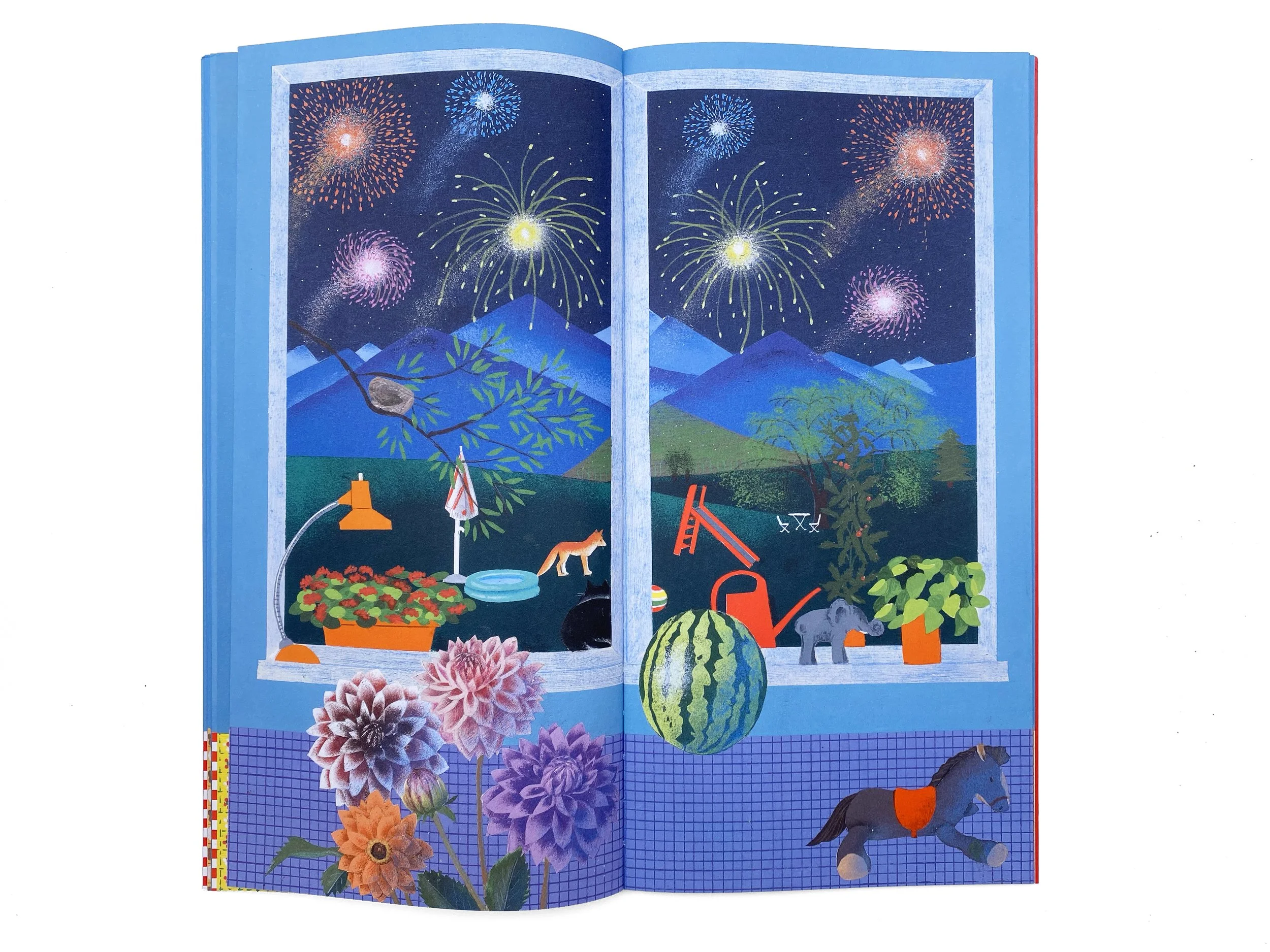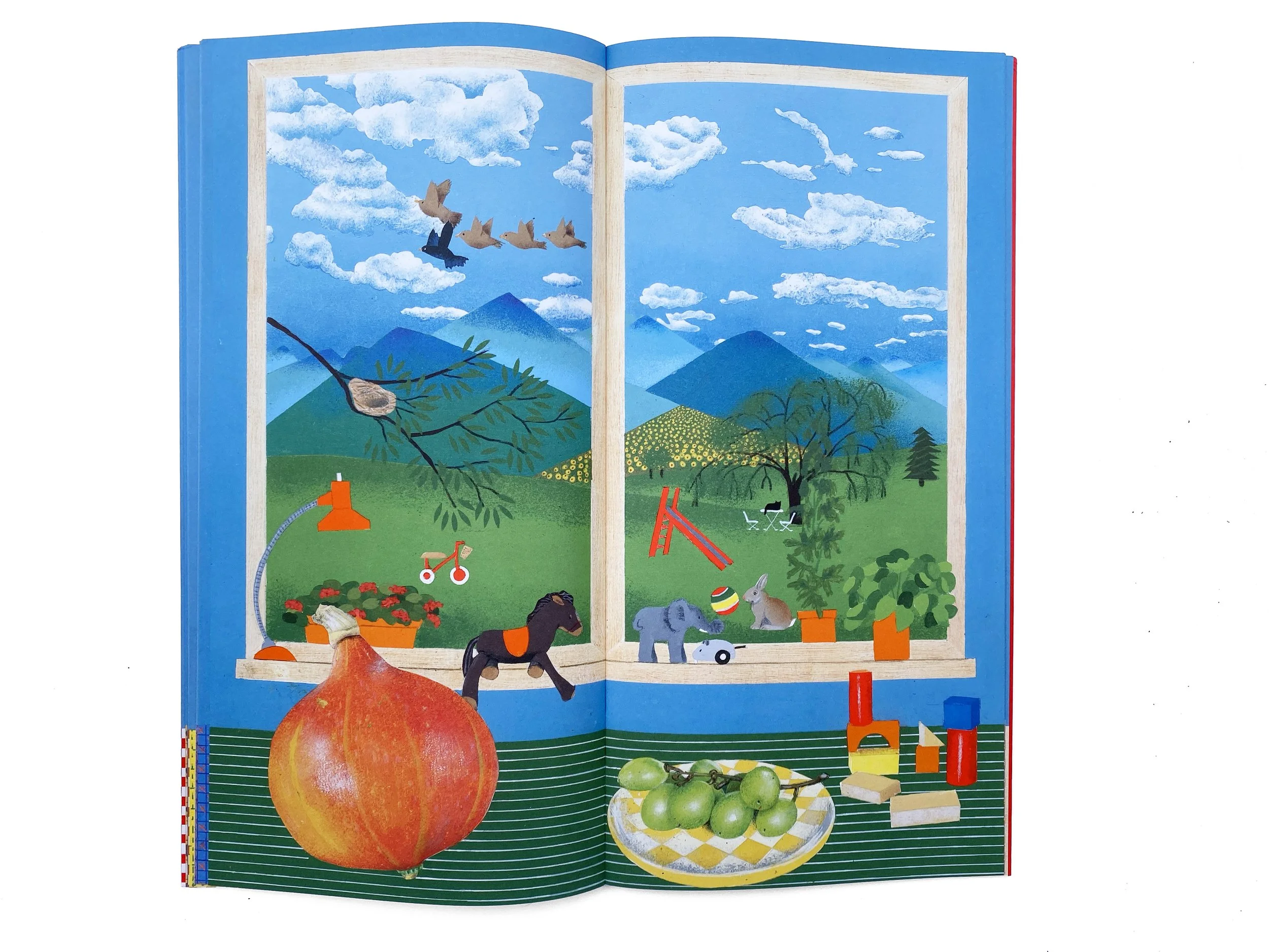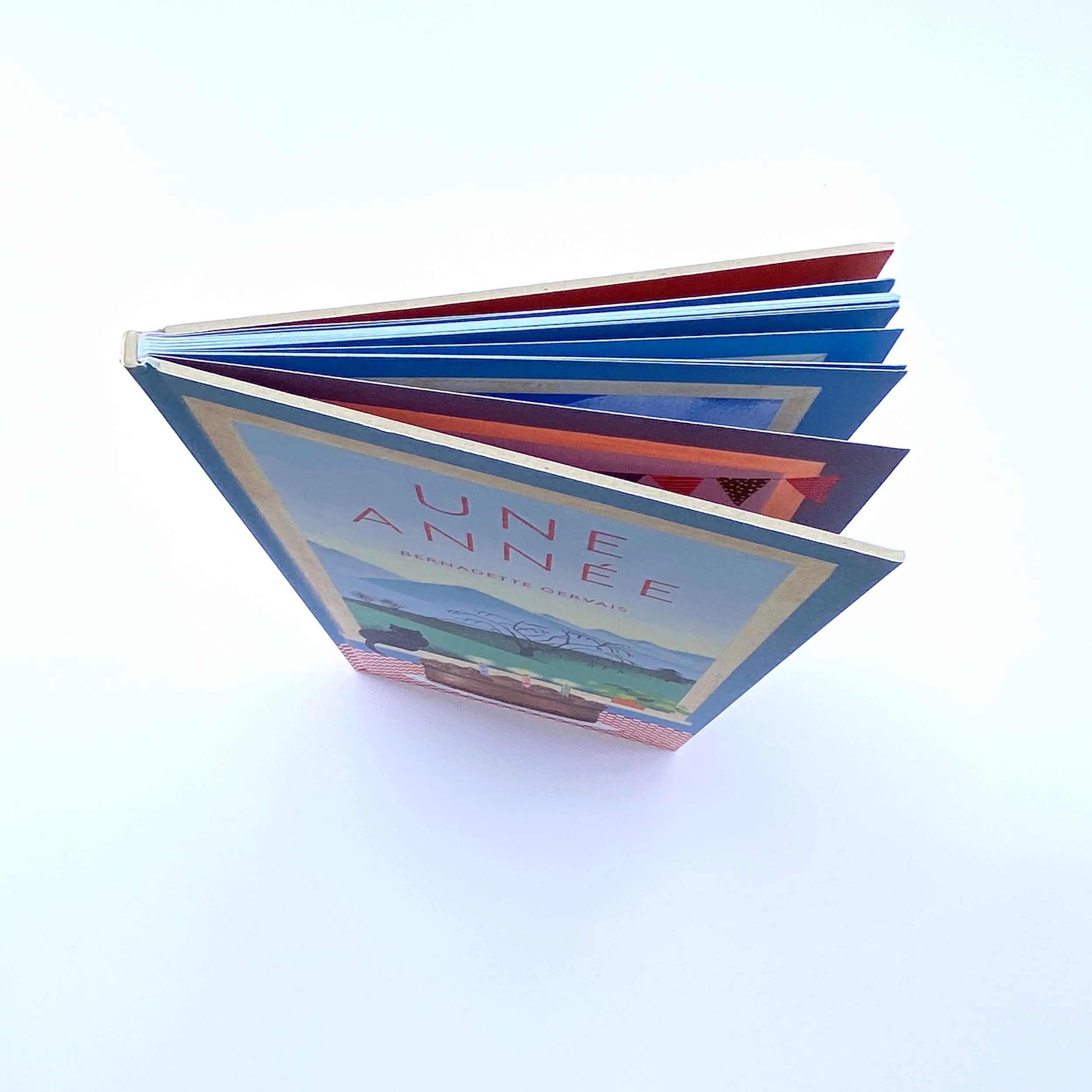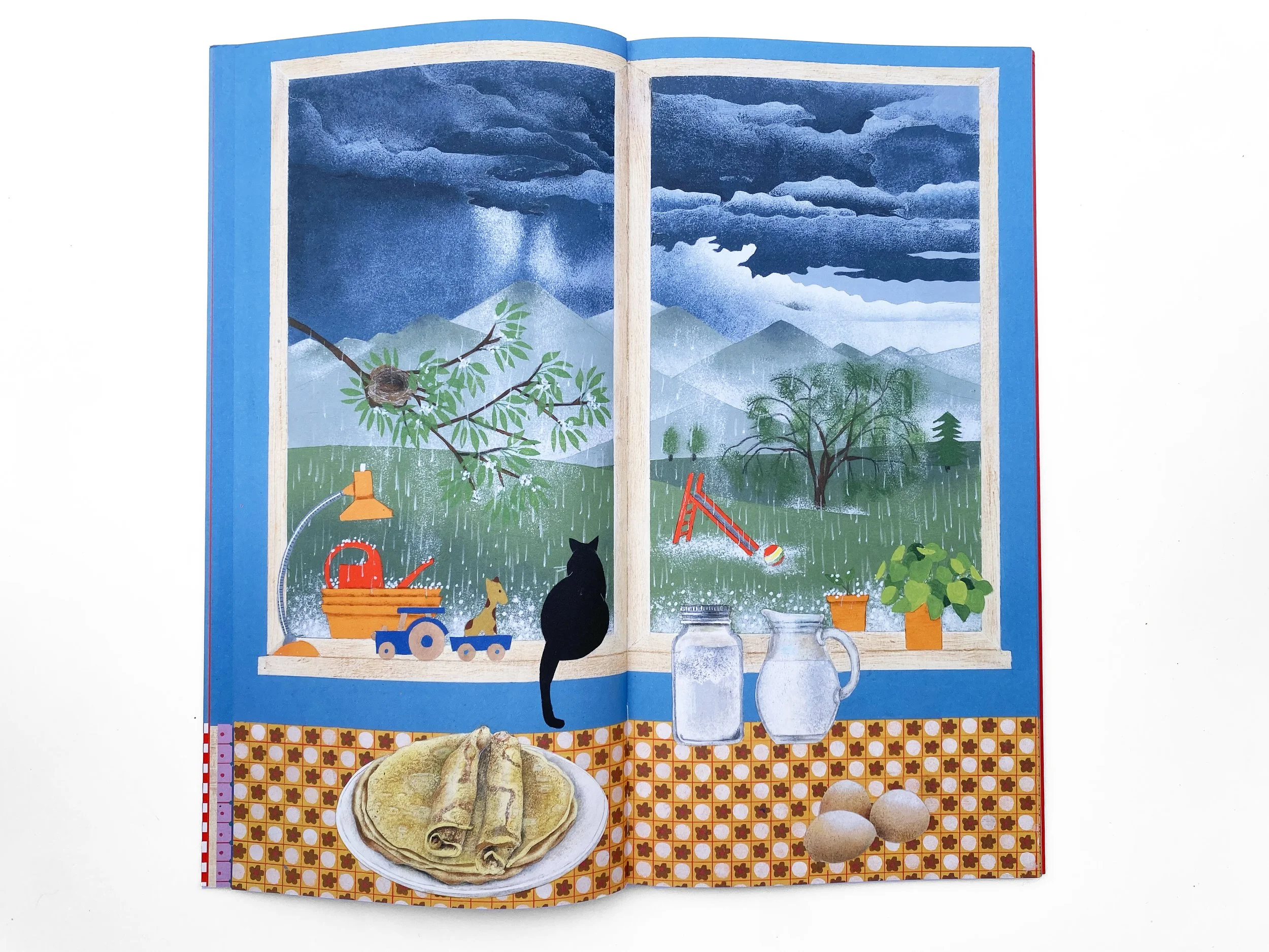 Bernadette Gervais raconte en 24 images le temps qui sépare deux gros gâteaux d’anniversaire : le premier ouvre le livre avec 3 bougies, le second le referme sur 4. Entre les deux, une fenêtre et un rebord de table forment le cadre fixe de la vie qui défile à l’intérieur et à l’extérieur : les saisons, la lumière, les couleurs, comme le quotidien d’un enfant à travers ses loisirs, ses repas, ses humeurs…