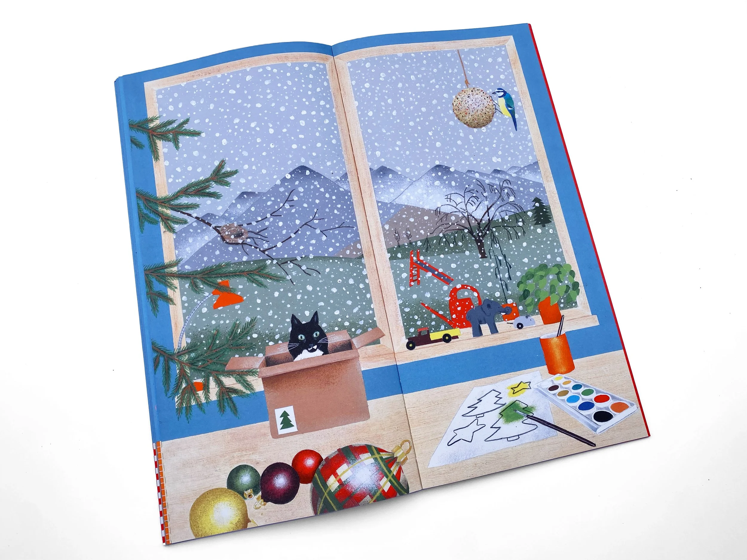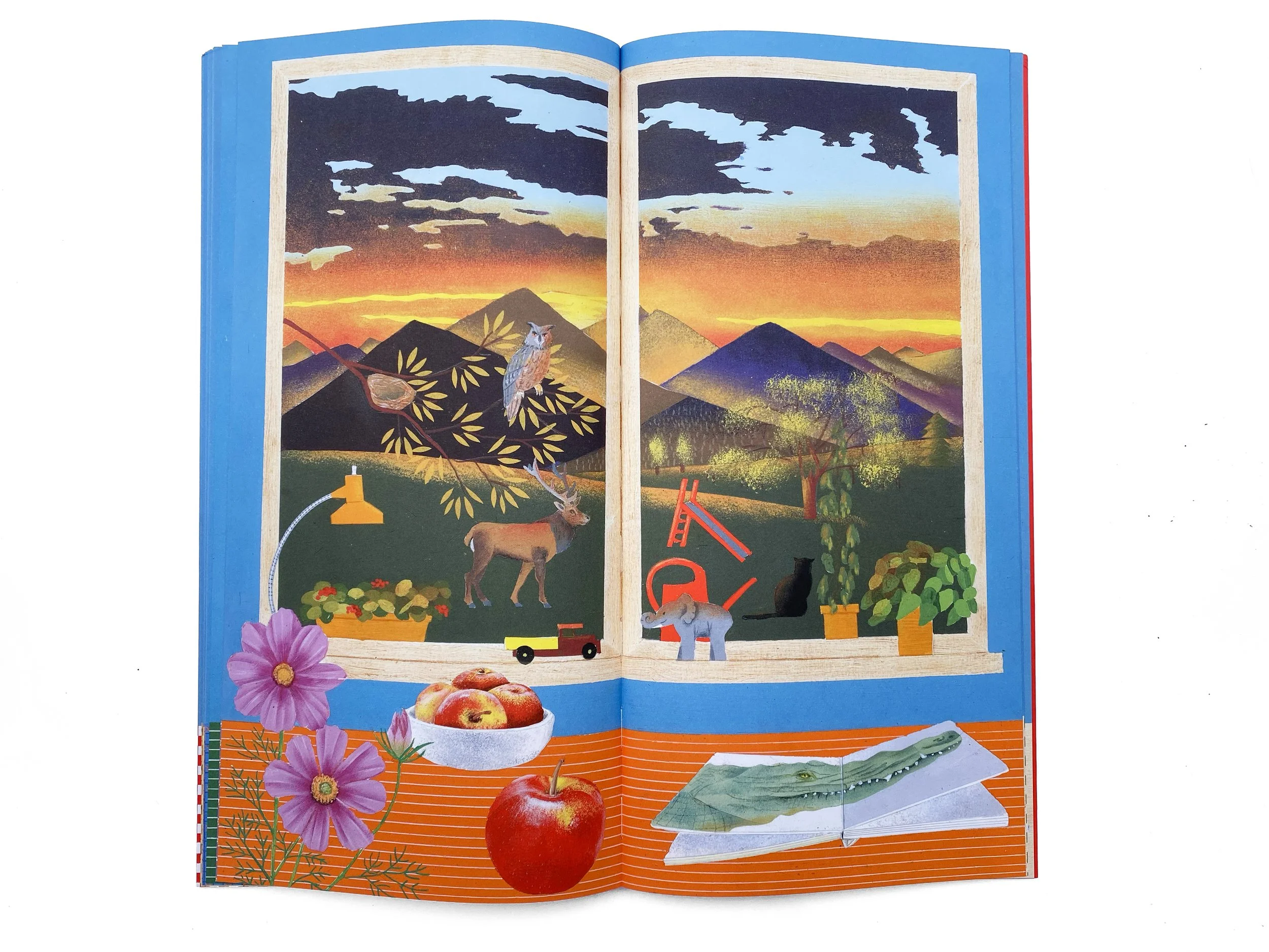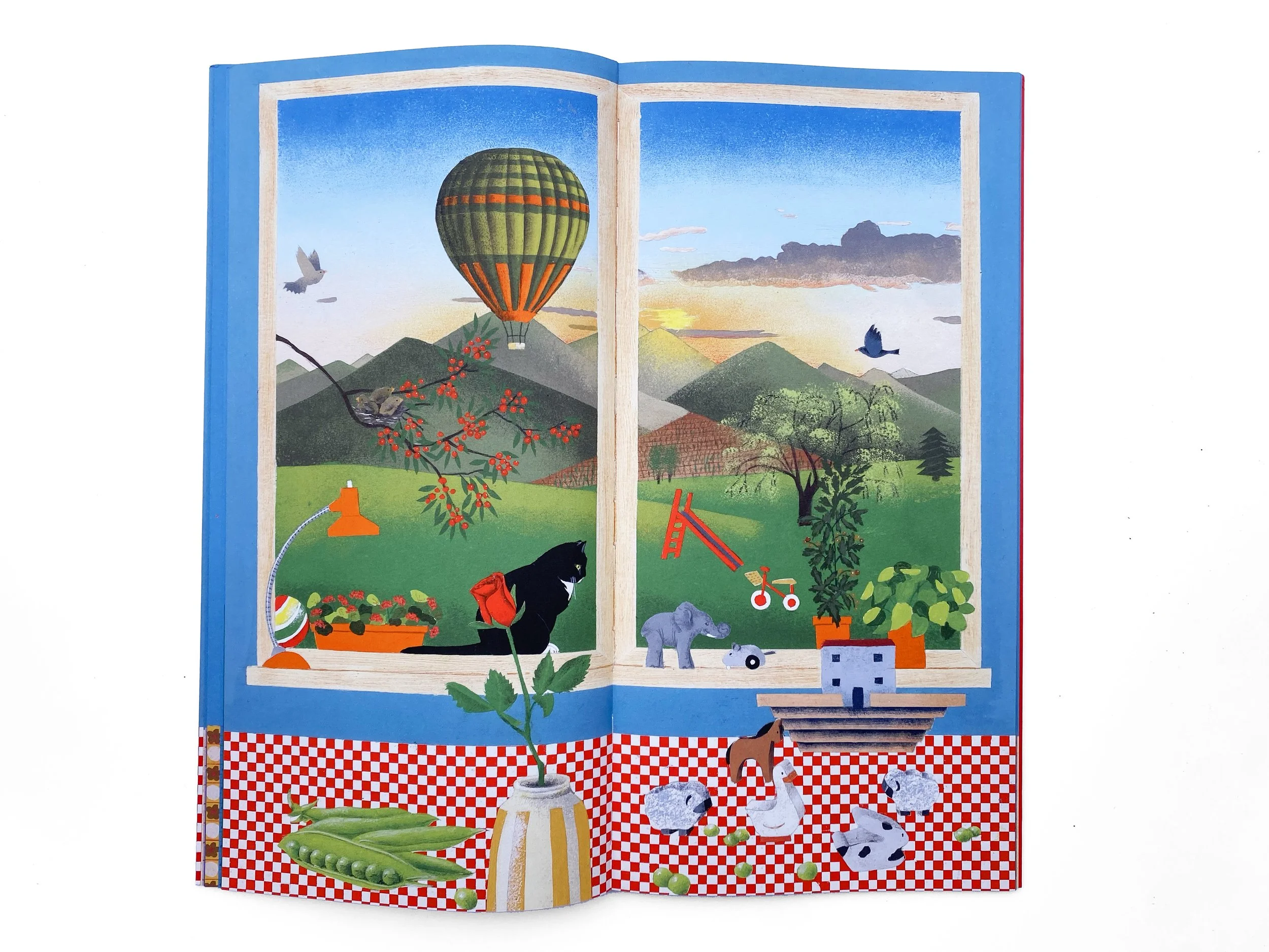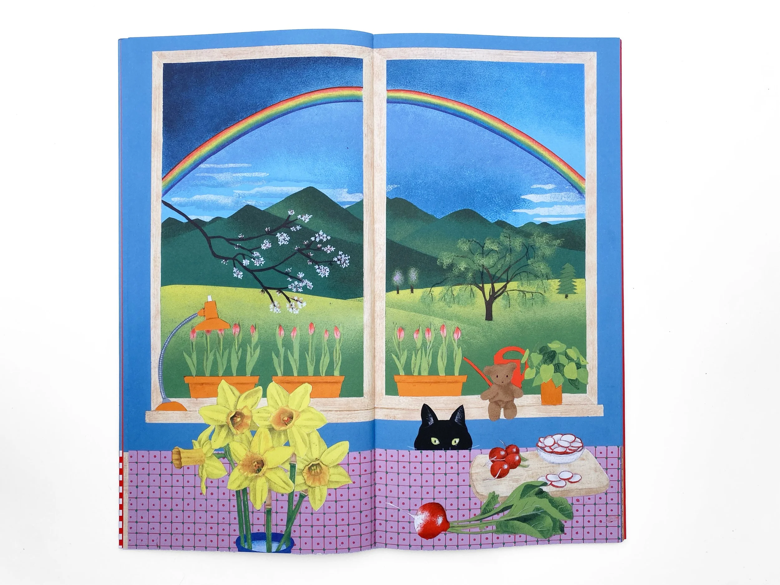 Bernadette Gervais raconte en 24 images le temps qui sépare deux gros gâteaux d’anniversaire : le premier ouvre le livre avec 3 bougies, le second le referme sur 4. Entre les deux, une fenêtre et un rebord de table forment le cadre fixe de la vie qui défile à l’intérieur et à l’extérieur : les saisons, la lumière, les couleurs, comme le quotidien d’un enfant à travers ses loisirs, ses repas, ses humeurs…